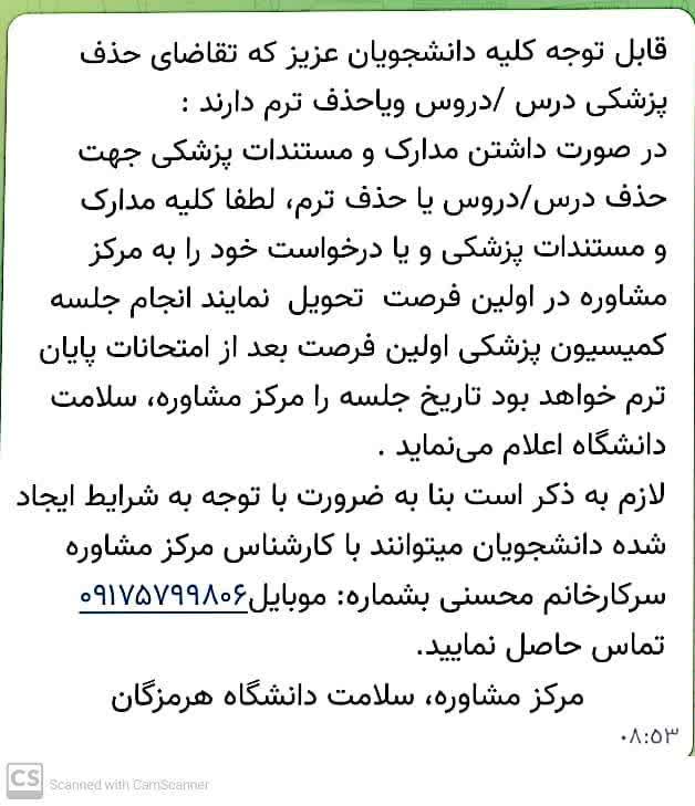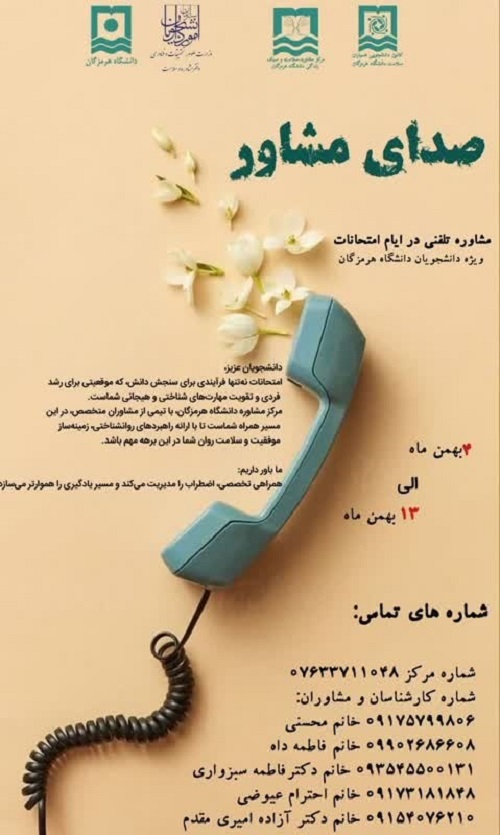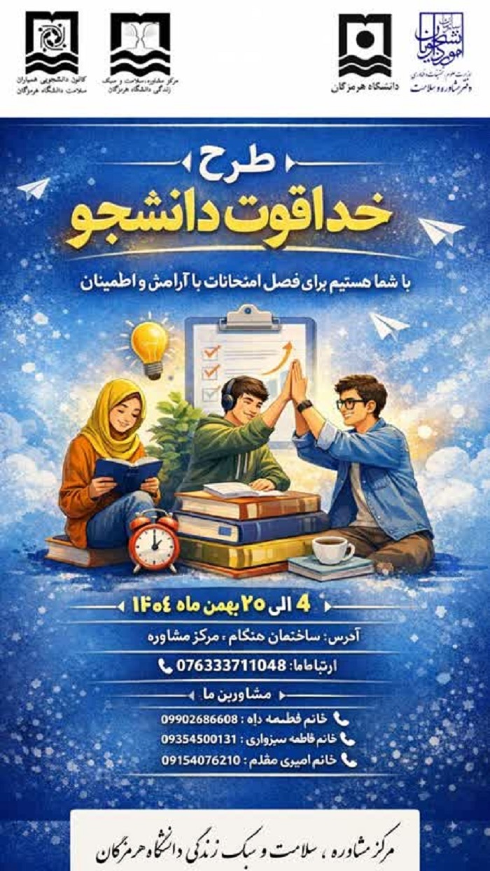 معرفی سامانه مشاوره آنلاین(سامانه سام) آغاز ثبت نام وام دانشجویی نیمسال اول 1402-1403 زمان بندی اعطای وام های تحصیلی و شهریه در نیمسال دوم 1401-1402 پذیرفته شدگان سوابق تحصیلی بهمن ماه 1401 متقاضی خوابگاه بروزرسانی سامانه فاز 2 صندوق رفاه دانشجویان تخفیف 25./. درمانگاه گلشهر برای دانشجویان اطلاعیه سلامت جسم دانشجویان اطلاعیه سرویس های ایاب و ذهاب دوشنبه مورخه 1401/8/30 راهنمای ثبت نام در سایت دانشگاه شماره حساب درآمدهای اختصاصی دانشگاه آغاز ثبت نام وام های دانشجویی 1402-1401 پروتکل های جدید بهداشتی مبارزه با کووید-19 (ویروس کرونا) در دانشگاه ها/ دانشکده ها/ مراکز آموزش عالی ثبت نام در سامانه تغذیه برنامه حرکت سرویس های ایاب و ذهاب دانشجویان دانشگاه هرمزگان در سال تحصیلی 1401 جشنواره بین المللی فرهنگ ملل اطلاعیه مهم سلف سرویس اطلاعیه تخلیه خوابگاه ها در ایام تعطیلات تابستان برنامه زمانبندی استفاده دانشجویان از سالن مطالعه کتابخانه مرکزی زمان ملاقات معاون محترم دانشجویی با دانشجویان گرامی ارائه خدمات رسانی سلف سرویس وام ضروری و ویژه دکتری