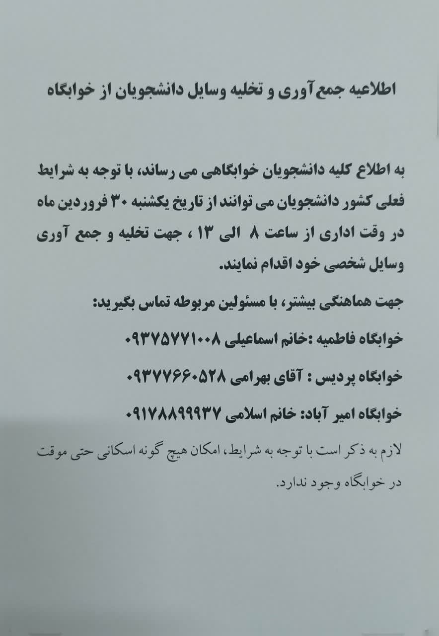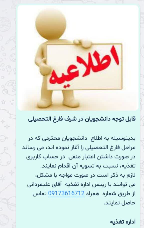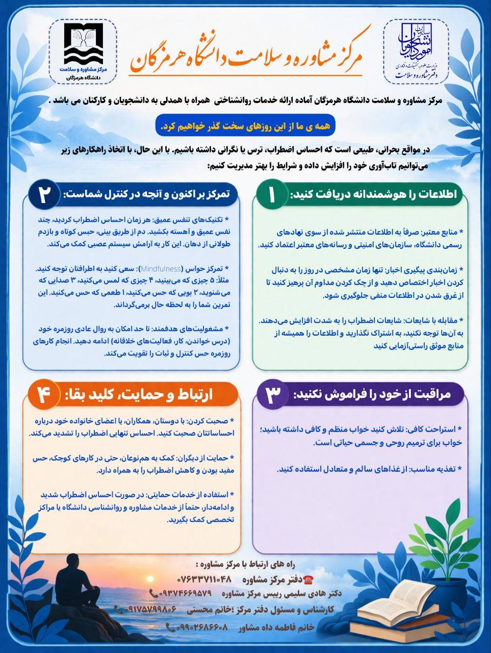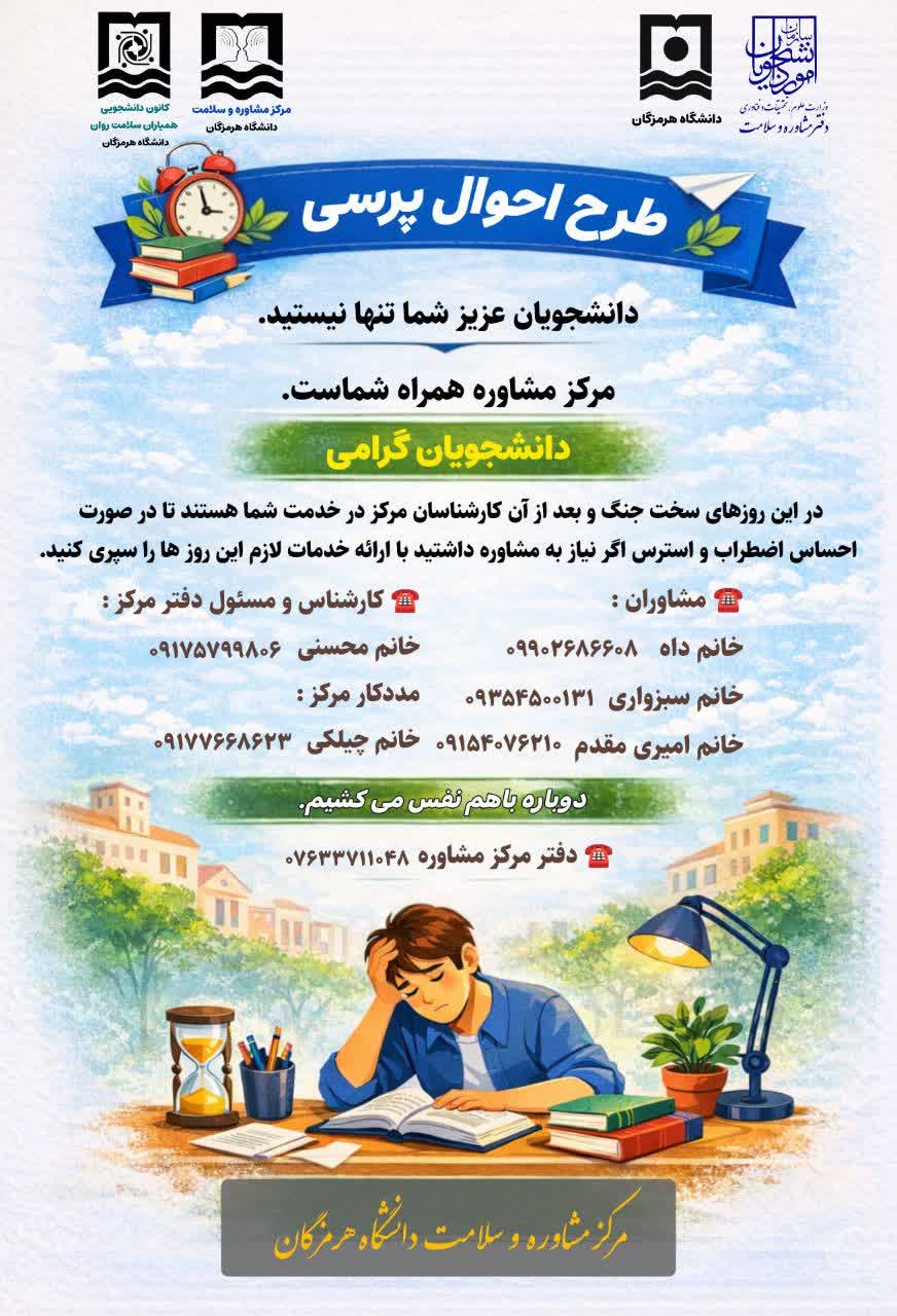 معرفی سامانه مشاوره آنلاین(سامانه سام) آغاز ثبت نام وام دانشجویی نیمسال اول 1402-1403 زمان بندی اعطای وام های تحصیلی و شهریه در نیمسال دوم 1401-1402 پذیرفته شدگان سوابق تحصیلی بهمن ماه 1401 متقاضی خوابگاه بروزرسانی سامانه فاز 2 صندوق رفاه دانشجویان تخفیف 25./. درمانگاه گلشهر برای دانشجویان اطلاعیه سلامت جسم دانشجویان اطلاعیه سرویس های ایاب و ذهاب دوشنبه مورخه 1401/8/30 راهنمای ثبت نام در سایت دانشگاه شماره حساب درآمدهای اختصاصی دانشگاه آغاز ثبت نام وام های دانشجویی 1402-1401 پروتکل های جدید بهداشتی مبارزه با کووید-19 (ویروس کرونا) در دانشگاه ها/ دانشکده ها/ مراکز آموزش عالی ثبت نام در سامانه تغذیه برنامه حرکت سرویس های ایاب و ذهاب دانشجویان دانشگاه هرمزگان در سال تحصیلی 1401 جشنواره بین المللی فرهنگ ملل اطلاعیه مهم سلف سرویس اطلاعیه تخلیه خوابگاه ها در ایام تعطیلات تابستان برنامه زمانبندی استفاده دانشجویان از سالن مطالعه کتابخانه مرکزی زمان ملاقات معاون محترم دانشجویی با دانشجویان گرامی ارائه خدمات رسانی سلف سرویس وام ضروری و ویژه دکتری